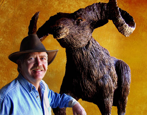 Tommy is at the leading edge of metal sculpturing by developing a new and challenging new technique which allows for exceptional detail and realism. The cross match in color created to form an integrated image in this portrait worked well to my satisfaction. The artist is in blue and has blue eyes. His hat and the color cast on his forehead, however, matches the colors of the sculpture and background, while on the sculpture there are blue tones that tie the sculpture to the artist.
